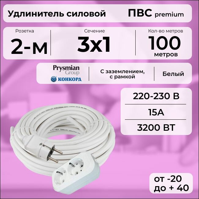 Удлинитель силовой «PREMIUM CABLE» кабель ПВС 3х1 белый, с 2-ой розеткой на рамке, электрический 100 м с заземлением: сравнение цен, характеристики, фото, актуальное наличие и цены.