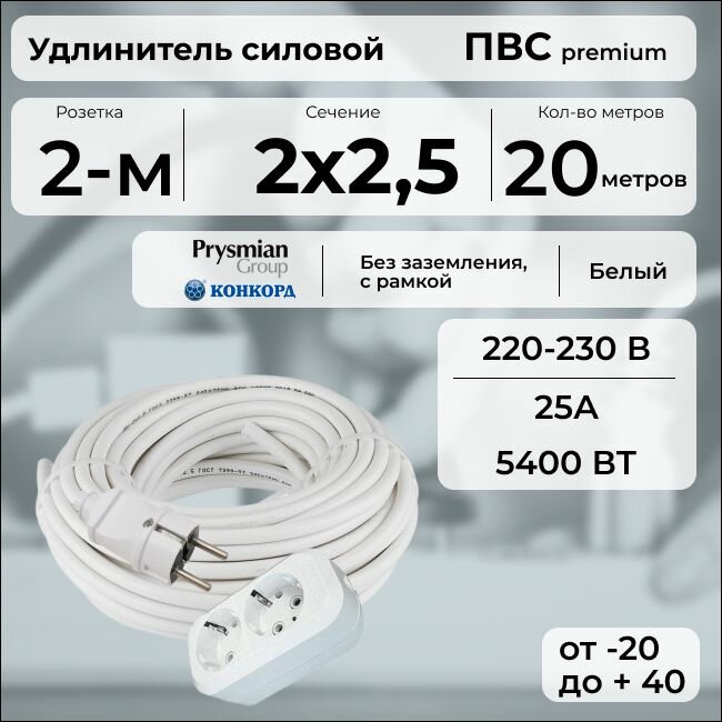 Удлинитель силовой «PREMIUM CABLE» кабель ПВС 2х2,5 белый, с 2 розетками на рамке, 20 м для электроприборов в бухте: сравнение цен, характеристики, фото, актуальное наличие и цены.