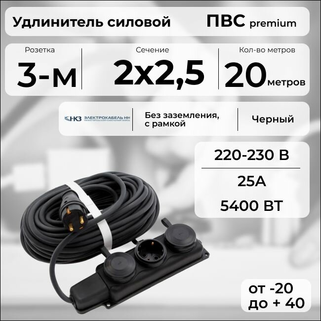Удлинитель силовой «PREMIUM CABLE» с 3 розетками на рамке, электрический 20 м кабель ПВС 2х2,5 черный ГОСТ: сравнение цен, характеристики, фото, актуальное наличие и цены.