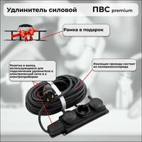 Купить Удлинитель силовой «PREMIUM CABLE» с 3-ой розеткой на рамке, кабель ПВС 2х0,75 черный, 35 м для электроприборов в бухте с доставкой по всей России.
