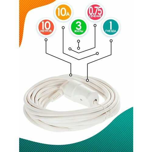 Удлинитель оснащен одним гнездом и подходит для подключения силовой техники, такой как электропилы, газонокосилки, культиваторы и многое другое. Номинальная сила тока составляет 10А, а число/сечение провода - 3*0,75 мм².