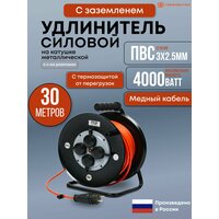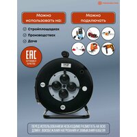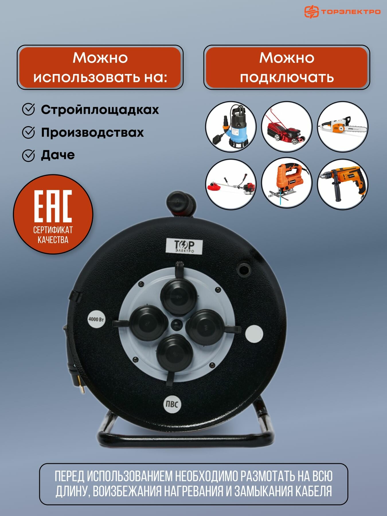 Удлинитель силовой на металлической катушке ТОР имеет четыре розетки, которые позволяют одновременно подключать несколько приборов и устройств. Кроме того, он оснащен заземлением, которое обеспечивает безопасность использования устройства и предотвращает возможные неисправности.