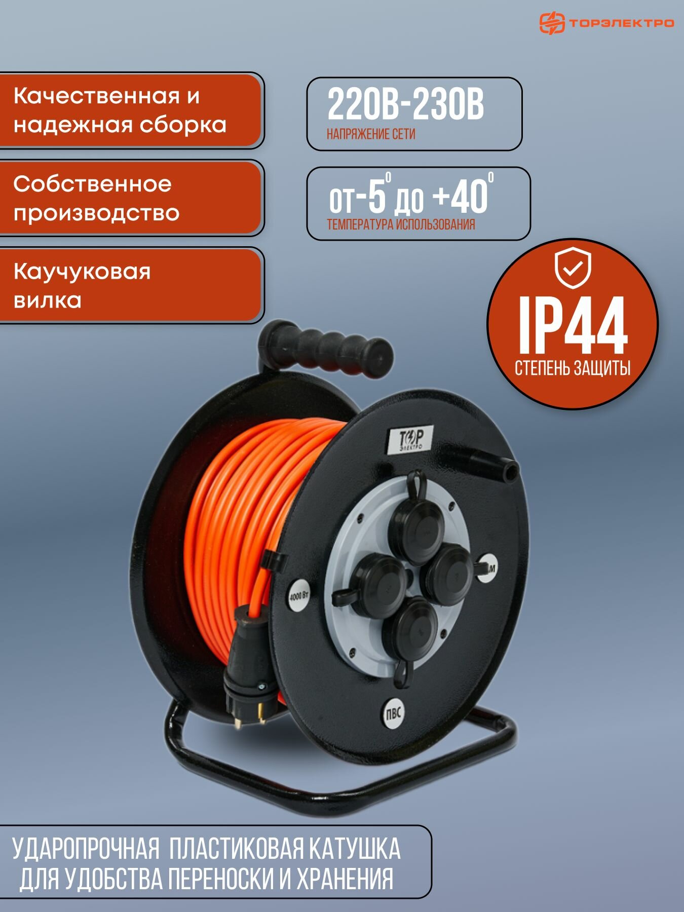 Удлинитель силовой на металлической катушке ТОР имеет высокую степень защиты от воды и пыли благодаря стандарту IP44, который обеспечивает защиту от попадания воды и пыли на внутренние компоненты устройства.