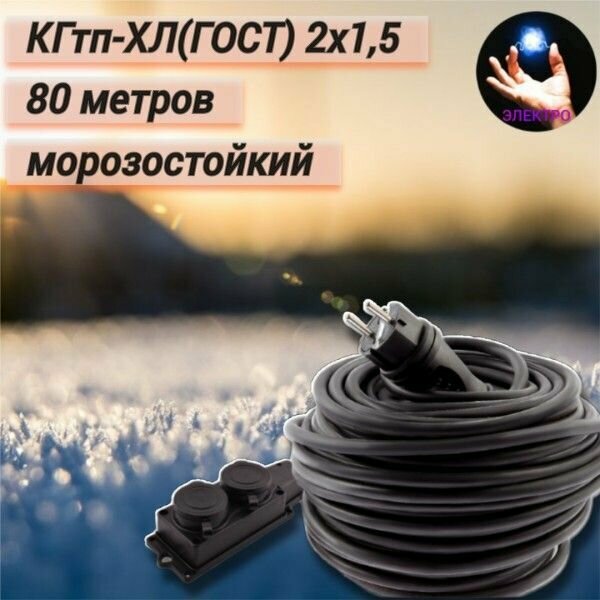 Удлинитель уличный всесезонный силовой морозостойкий и двойной колодкой с крышками каучук в бухте без заземления, 2 х 1,5 мм2 80м. с кабелем КГтп-ХЛ (ГОСТ) - это качественное и надежное решение для подключения электрооборудования на строительных площадках , во время ремонтных работ в условиях низких температур так и высоких температур от -60℃ до +50℃. . Не подключать через тройник. Токопроводящая жила – медная, круглой формы. Продукт оснащен морозостойким кабелем длиной 80 м из двух медных жил сечением 1,5 мм2 каждая. Вилка электрическая каучук. Количество розеток - 2 шт. Изготовленный согласно ГОСТу . Кроме того, удлинитель имеет кабель КГтп-ХЛ, который соответствует ГОСТу и обладает повышенной гибкостью и прочностью. Это позволяет уверенно работать в холодные зимние дни и использовать во все времена года без риска повреждения кабеля. Колодка 2-ная с крышками IP44 каучук обеспечивает надежное соединение с электрооборудованием и защиту от пыли и брызг воды. Это очень важно при работе на открытом воздухе или во влажных условиях. Электрический всесезонный инструмент длиной 80 м позволяет подключать устройства на значительное расстояние от источника питания такие как: снегоуборочная машина, гирлянда, газонокосилка, триммер, кусторез, измельчитель веток, строительный пылесос, дрель, перфоратор, электропила, электрорубанок и другие приборы, что обеспечивает большую гибкость шнура и удобство в использовании. Удлинитель поставляется с вилкой и двойной колодкой с крышками каучук и черным уличным силовым проводом, который гарантирует надежное электрическое соединение. Кабель-шнур силовой является полезным и удобным инструментом для дома, гаража, офиса, подсобных и служебных помещений, для сада и дачи. В целом этот строительный всесезонный морозостойкий аксессуар– незаменимый помощник и актуален в тех случаях, когда стационарный источник электропитания значительно удалён. Длительно допустимый ток кабеля 16А. Номинальный ток вилки и колодки 16А