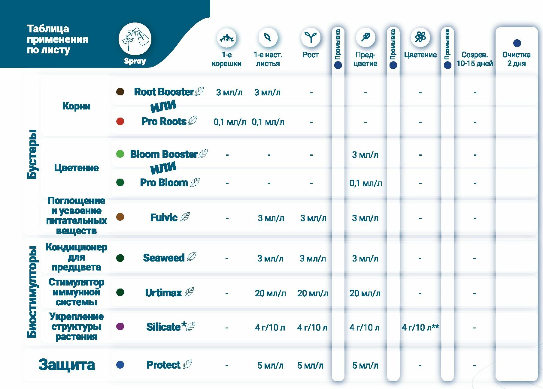 - разведите продукт в воде для опрыскивания листвы или добавьте в воду для полива или питательный раствор. Используйте во период роста и раннего цветения или по необходимости;