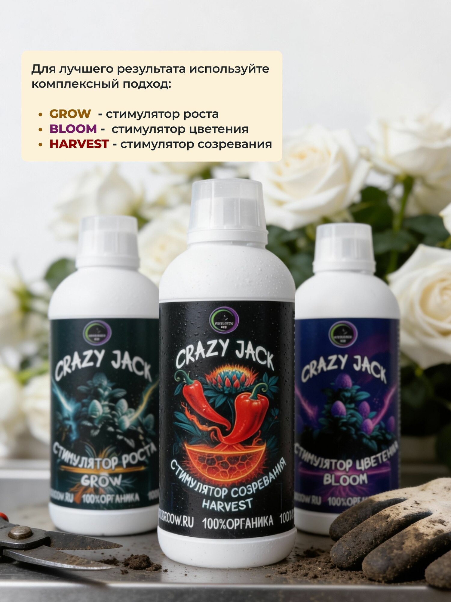 CRAZY JACK от ecoGroow 250мл — это сбалансированное, полностью органическое удобрение, которое можно использовать на протяжении всего периода роста. Рекомендуется начинать с момента появления первого листа и до окончания периода формирования плодов. Crazy Jack Bloom 250мл является самым важным компонентом для цветения. В период, когда у растения повышается потребность в фосфоре, он помогает раскрыть его урожайный потенциал. Crazy Jack Bloom - основное удобрение, которое подходит для всех видов субстратов на стадии цветения. Данное удобрение укрепляет растения и способствует обильному цветению. Crazy Jack Harvest 100мл — это специальное удобрение для стадии созревания. Ускоряет процесс цветения, сокращает жизненный цикл растения. На завершающих стадиях своего жизненного цикла, растение сокращает потребление питательных веществ. В это время требуется особый подход к кормлению.