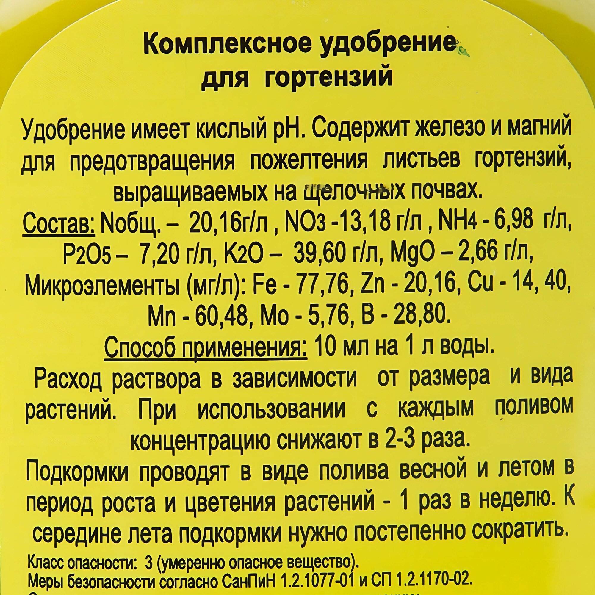 Удобрение для гортензий, жидкий концентрат. Питает и укрепляет корневую систему, стимулирует образование пышных бутонов, продлевает период цветения.