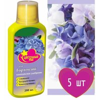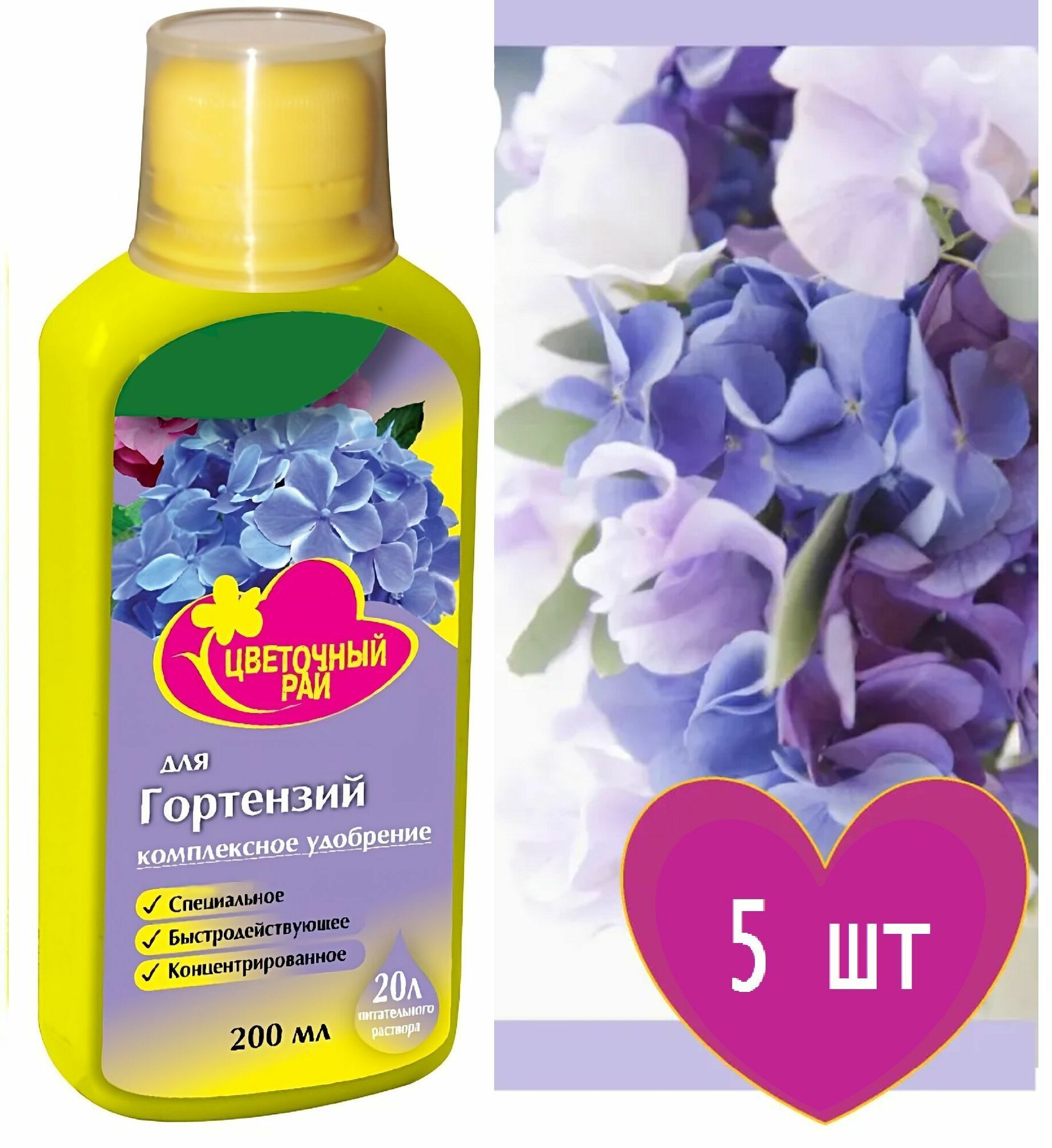 Удобрение для гортензий «Цветочный рай» 5×0,2 л. Питает и укрепляет корни, предохраняет от болезней, стимулирует образование бутонов, продлевает цветение