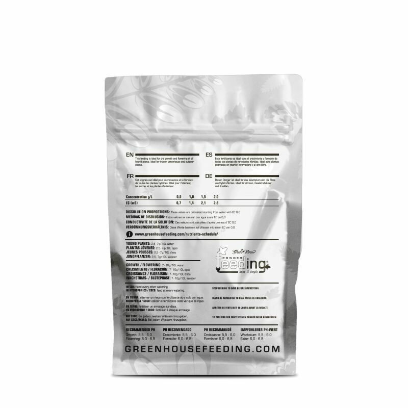 Удобрение специально разработано для гибридных видов растений со средним сроком цветения 8-9 недель. Микроэлементы удобрения находятся в хелатной форме, благодаря этой формуле результат виден через несколько дней. Минимум усилий и простота использования – гарантия хорошего урожая. Удобрение не содержит кальций, поэтому его необходимо добавлять в осмотическую воду или развести с водопроводной водой. Подготовленный раствор может использоваться в течение недели, так как растворенные микроэлементы на данный промежуток времени сохраняют свои свойства.