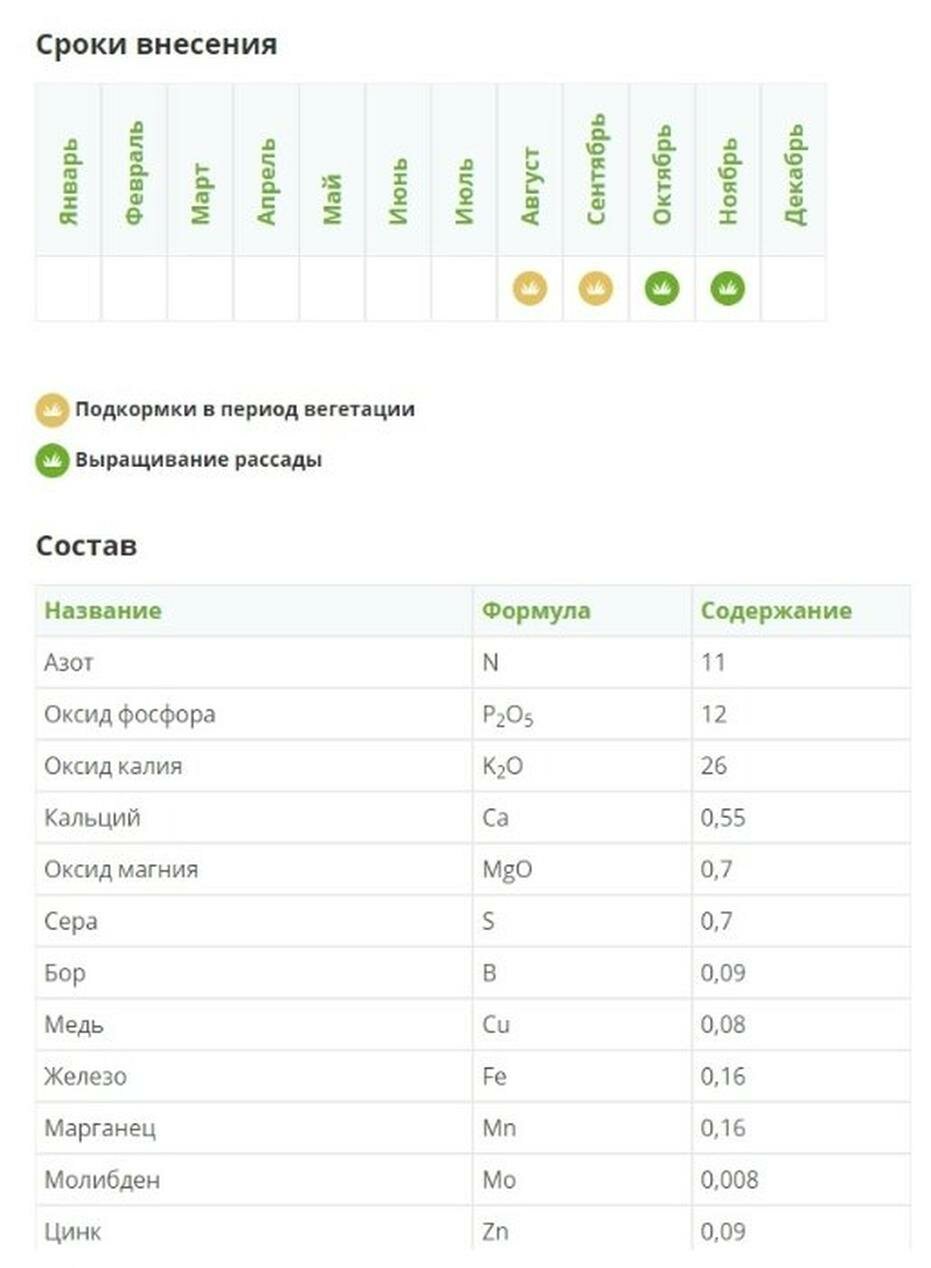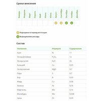 Азот N – 18,Оксид фосфора P2O5 – 9,Оксид калия K2O – 11,Кальций Ca - 0.55,Оксид магния MgO - 0.5,Оксид серы SO3 - 0.7,Бор B - 0.09,Медь Cu - 0.08,Железо Fe - 0.16,Марганец Mn - 0.16,Молибден Mo - 0.008,Цинк Zn - 0.09