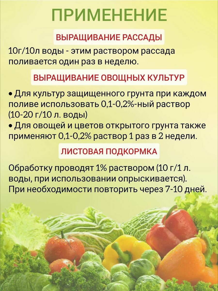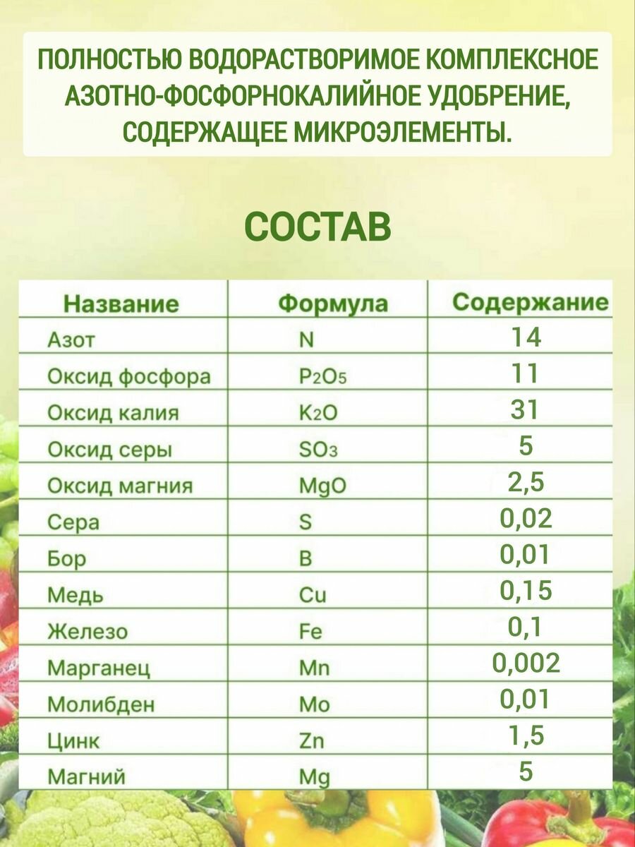 | Состав | азот, N – 14%, оксид фосфора, P2O5 – 11%, оксид калия, K2O – 31%, оксид магния, MgO – 2,5%, сера, S – 5%, бор, B – 0,02%, медь, Cu – 0,01%, железо, Fe – 0,15%, марганец, Mn – 0,01%, цинк Zn – 0,001%, молибден – 0,002% |