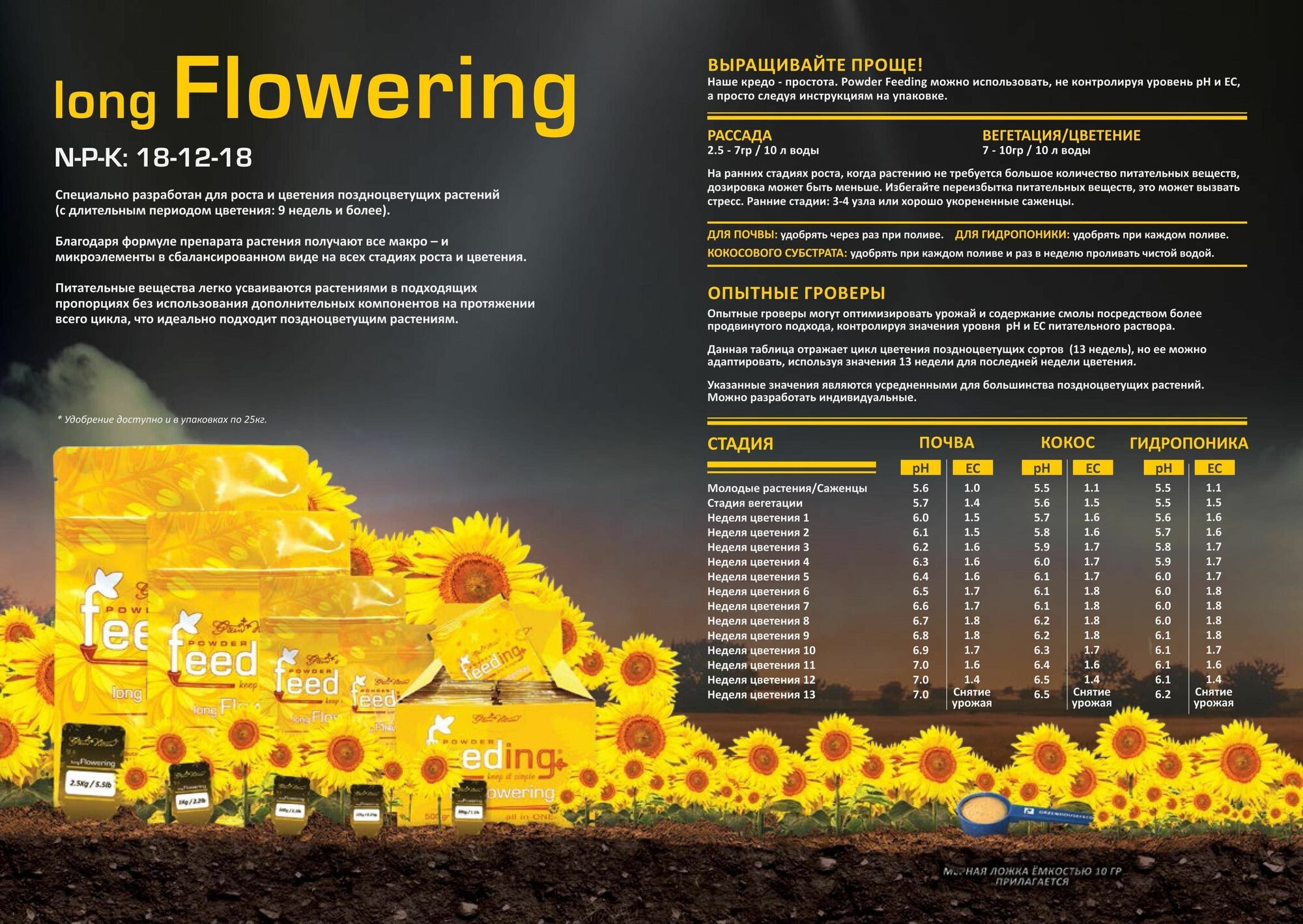 Это рассыпчатая порошковая смесь, оптимизированная специально для выращивания растений с длинным периодом цветения. Средство обеспечивает идеально сбалансированный набор питательных элементов, способствующих обмену веществ во время продолжительного периода цветения. Препарат может применяться в самых различных условиях и разных методах растениеводства: почвенное выращивание, субстраты, гидро- и аэропоника. Везде результаты от его применения будут отличными.