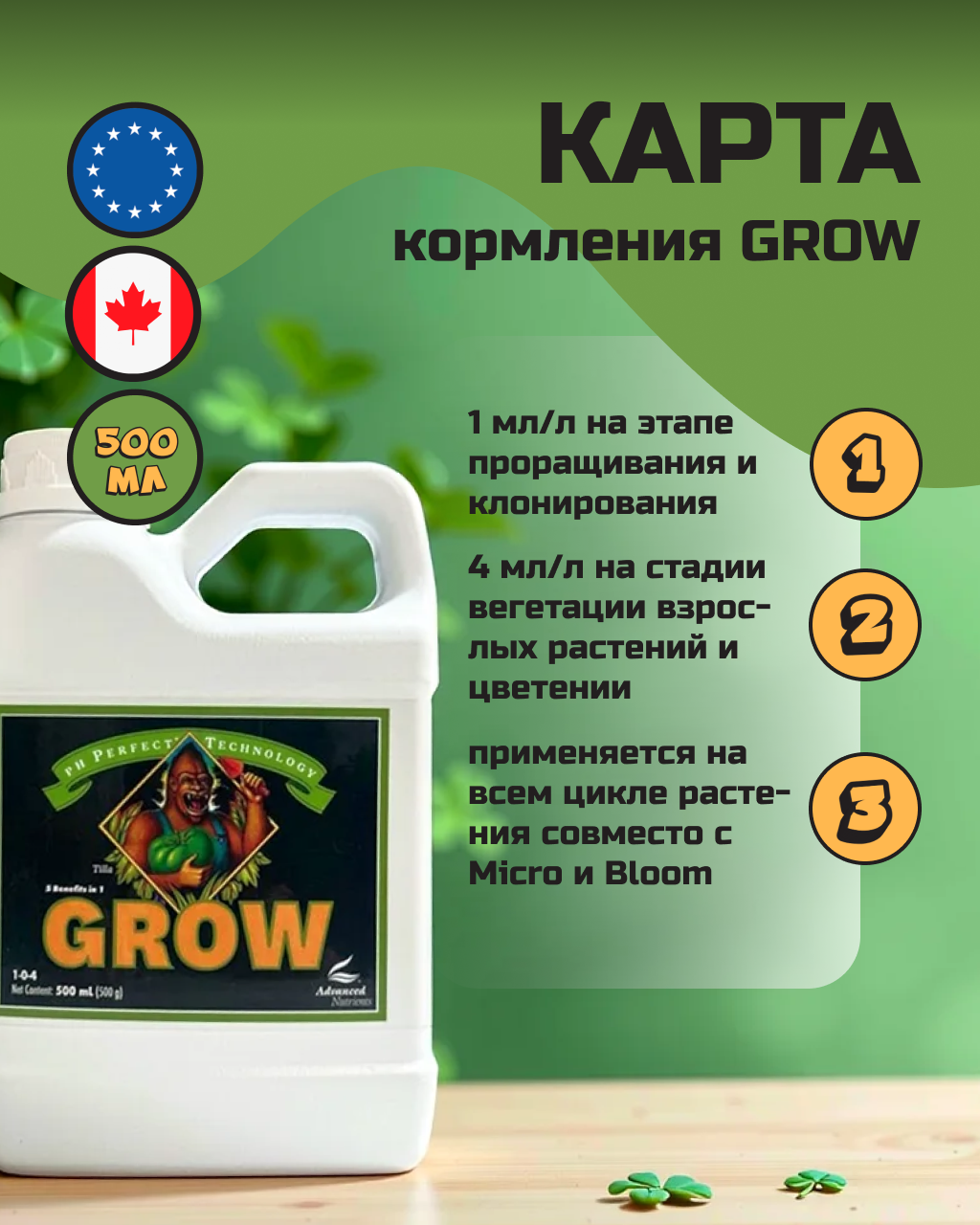 Используя все три части этого удобрения (Grow, Bloom и Micro), вы гарантированно обеспечите растения всеми необходимыми веществами и микроэлементами для питания и роста. Наличие в удобрения кальция, фосфора и азота позволяет создать здоровую питательную структуру и стимулировать урожайность и рост ваших растений.