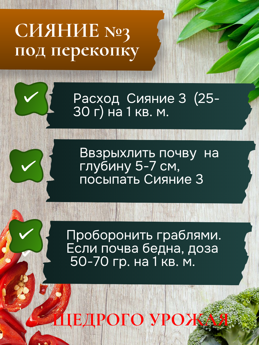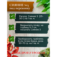 Для корневого полива необходимо развести 100 мл удобрения в 10 литрах воды. Поливать растения таким раствором следует раз в 14 дней. Для ускорения формирования компоста необходимо посыпать порошком «Сияние 3» мелкие органические отходы, уложенные слоем около 25 см. Заготовка проливается водой, а затем присыпается 2-сантиметровым слоем земли. Срок годности не ограничен при температуре от 0 до +30 градусов.
