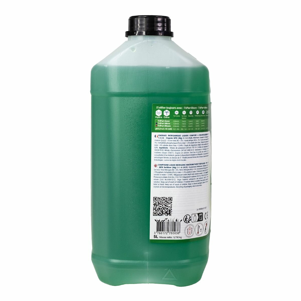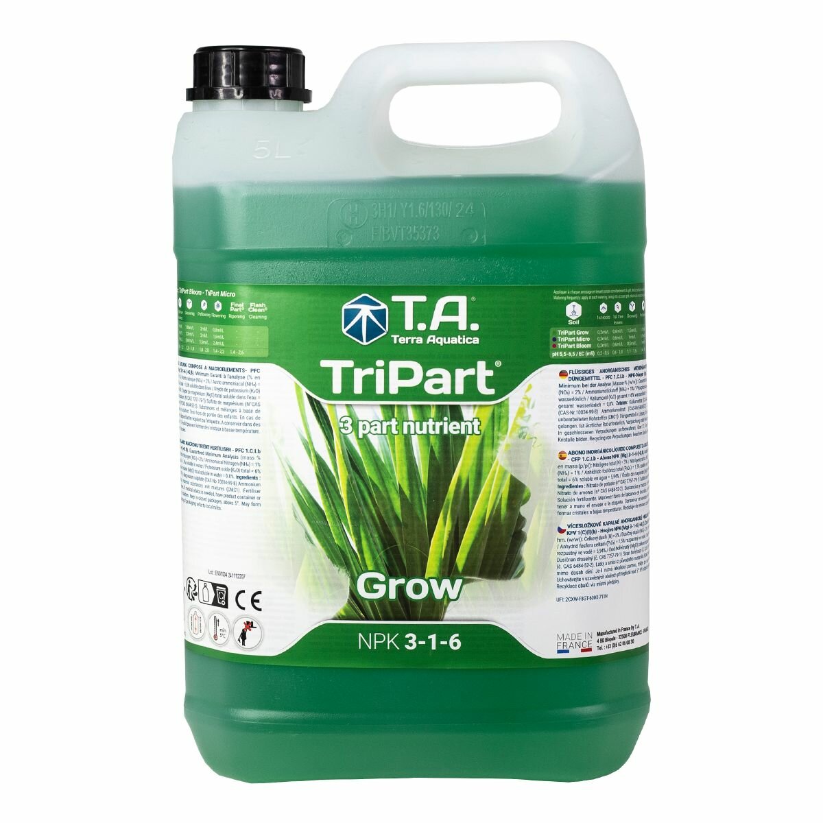 Удобрение TriPart Gro / Flora Gro GHE 5 л - обеспечивает растение Азотом (N), Калием (K), Магнием (Mg) и дополнительным минералами, стимулируя бурное развитие внутренней и внешней структуры растения на вегетативной стадии.