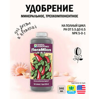Купить Удобрение трёхкомпонентное базовое General Hydroponics FloraMicro (USA) 946 мл. с доставкой по всей России.