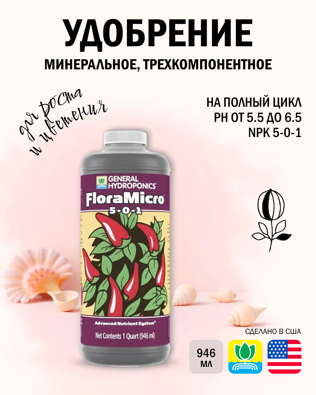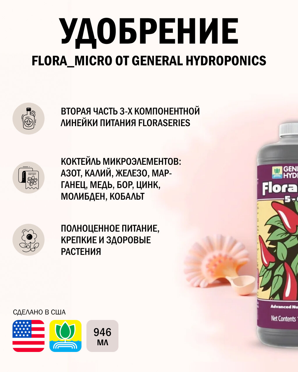 Удобрение трёхкомпонентное базовое General Hydroponics FloraMicro (USA) 946 мл.: сравнение цен, характеристики, фото, актуальное наличие и цены.