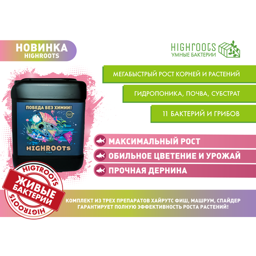 Жидкое удобрение от российской компании «Умные бактерии» HIGHROOTS FISH/ хайрутс ФИШ 10000 мл. – это стимулятoр корнеобpaзования, ростa и питания, дeкoративности и плодоношения растений. Не имеет цвета и запаха, а благодаря натуральному составу из живых бактерий, абсолютно безопасно для окружающей среды. Бактериальное удобрение предназначено для форсированного роста растения и его корневой системы, цветения, плодоношения, для борьбы с патогенной микрофлорой и ускоренного образования дернины повышенной прочности. Удобрение для семян цветов и овощей способствует формированию симбиотических отношений корня растения с полезными бактериями, что помогает корням потреблять больше питательных веществ, улучшать минеральное питание и водный баланс растений. Бактерии для корневой системы обладают способностью производить антибиотики, обеспечивающие ее защиту от гнилей; образуют гумус из животных и растительных остатков; извлекают питательные вещества из разлагающегося материала и трансформируют их в доступную для растений форму, что играет важную роль в дезинфекции почвы; а также синтезируют и экспортируют гормон роста - ауксин, стимулирующий рост корнеобразования и самого растения. Био удобрение стимулятор роста отлично подойдет для комнатных растений: цветов и зелени, рассады овощей, плодовых и хвойных деревьев и кустарников, а также для ягодных культур и салата. Не использовать для питья! Также эффективно как удобрение для микрозелени для выращивания на подоконнике и всех домашних цветущих растений: роз, гортензий, клубники, малины и др. Можно использовать даже для голубики и лесных ягод. Применяется для теплиц, парника, открытого грунта и тд.