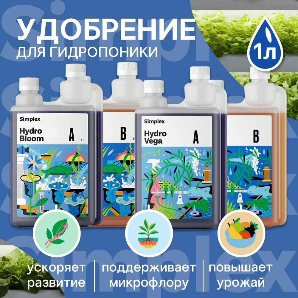 Simplex Hydro Vega A+B – это линейка базовых удобрений, содержащих органические и минеральные компоненты, для подкормки растений на этапах их вегетации и предцвета. Их можно использовать на открытых и закрытых грунтах при выращивании растений с любыми видами гидропонных систем. Использование Simplex Hydro Vega A+B для подкормки дает следующие преимущества:
