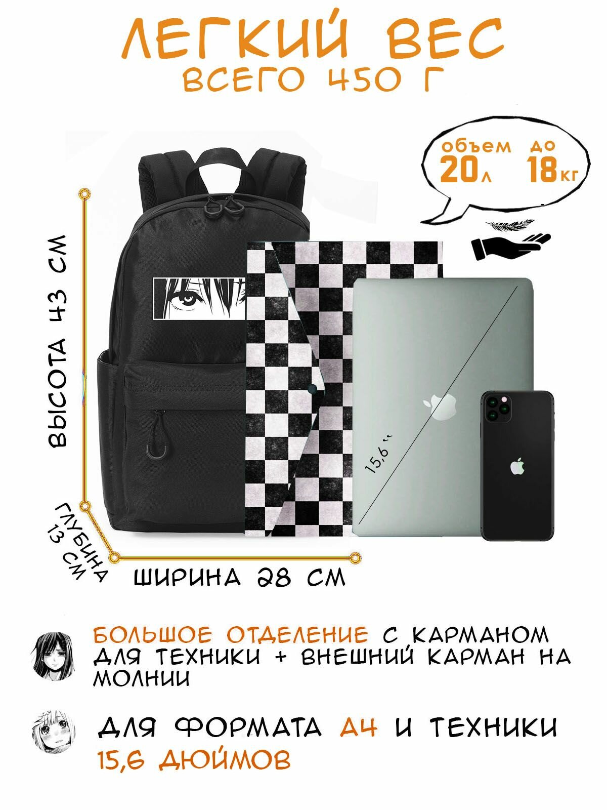 вентилируемые лямки, водоотталкивающая пропитка, ручка для переноски, светоотражающие элементы, эргономичная спинка