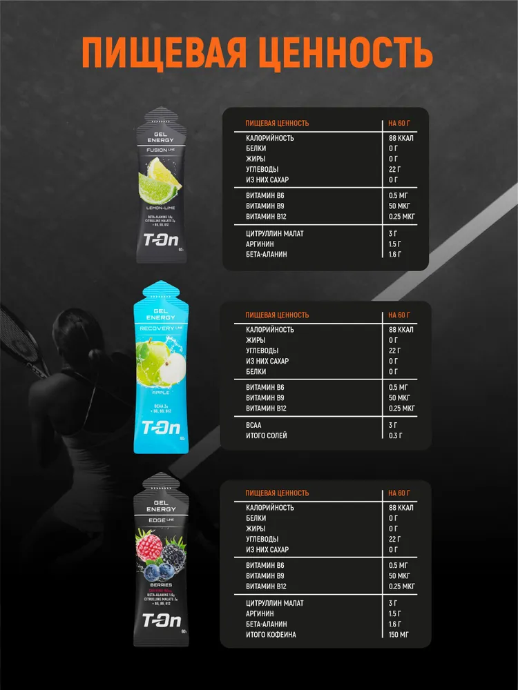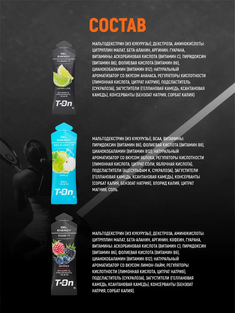 | Дополнительная информация | Гель энергетический - набор для циклических видов спорта; Гель с кофеином для энергии и спортивных достижений |
