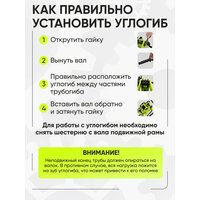 Чтобы установить углогиб на трубогиб, необходимо открутить гайку, достать вал, установить углогиб так, чтобы центральная планка рамы была между выступами центральной пластины углогиба, вставить вал обратно и закрутить гайку. Для работы с углогибом необходимо снять шестерню с вала подвижной рамы.