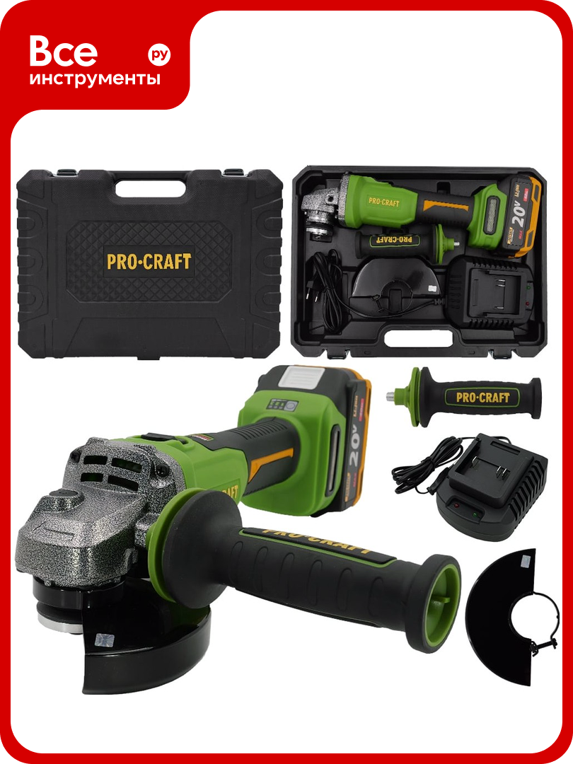 Углошлифовальная машина PROCRAFT аккумуляторная 20В 125мм 3500/6000/8000 об/мин (АКБ 4АЧ+ЗУ) PWA220: сравнение цен, характеристики, фото, актуальное наличие и цены.