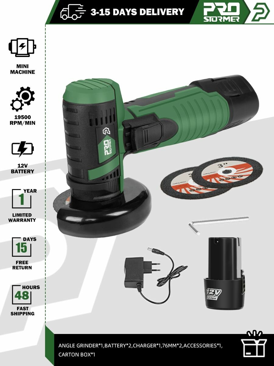 Угловая мельница,76 мм,12 В/1,5 Ач, От аккумуляторный,2 АКБ, PROSTORMER, PSCG00102A: сравнение цен, характеристики, фото, актуальное наличие и цены.