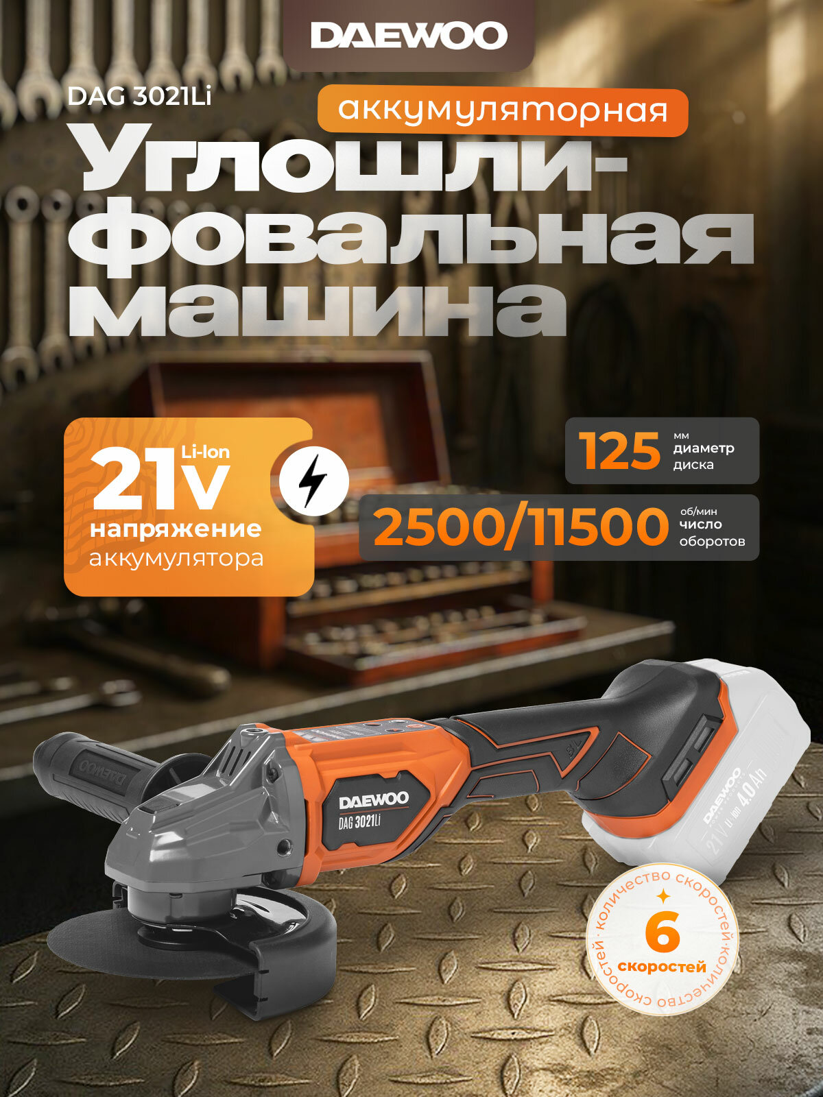 Купить Угловая шлифмашина аккумуляторная DAEWOO DAG 3021Li без АКБ и ЗУ с доставкой по всей России. Угловая шлифмашина аккумуляторная DAEWOO DAG 3021Li без АКБ и ЗУ: сравнение цен, характеристики, фото, актуальное наличие и цены.