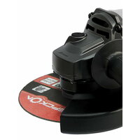 двуручная, фиксация шпинделя, блокировка кнопки включения, антивибрационная система, дополнительная рукоятка, регулировка положения кожуха без инструмента, защитный кожух