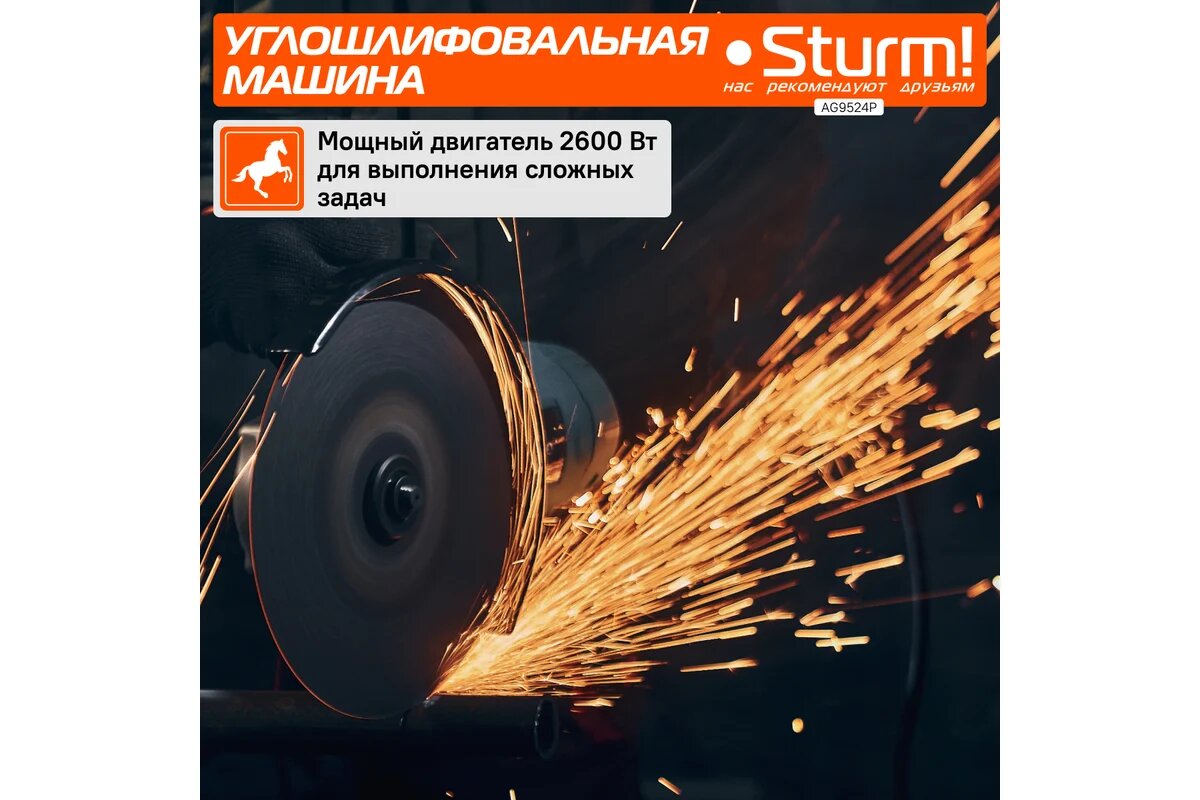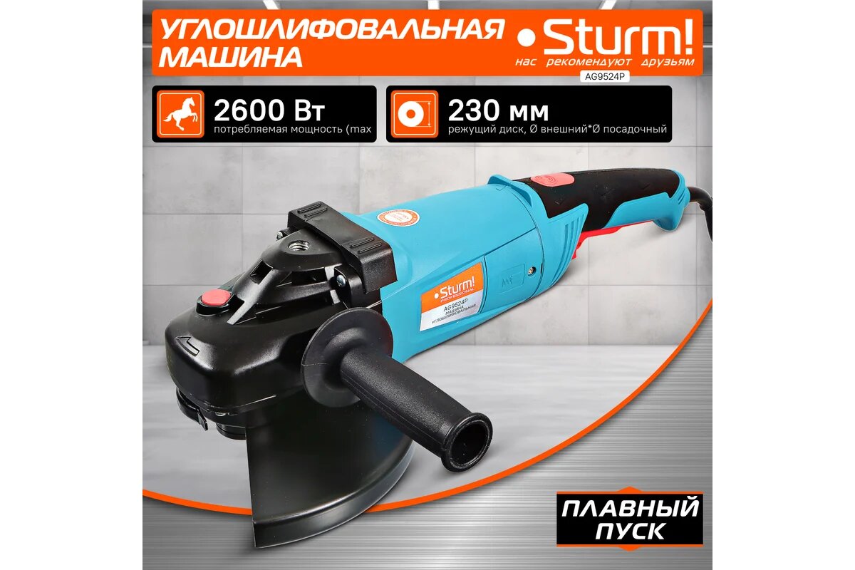 Угловая шлифмашина Sturm! AG9524P, потребляемая мощность 2600 Вт, максимальное число оборотов 6000 об/мин: сравнение цен, характеристики, фото, актуальное наличие и цены.