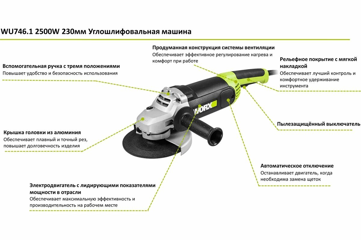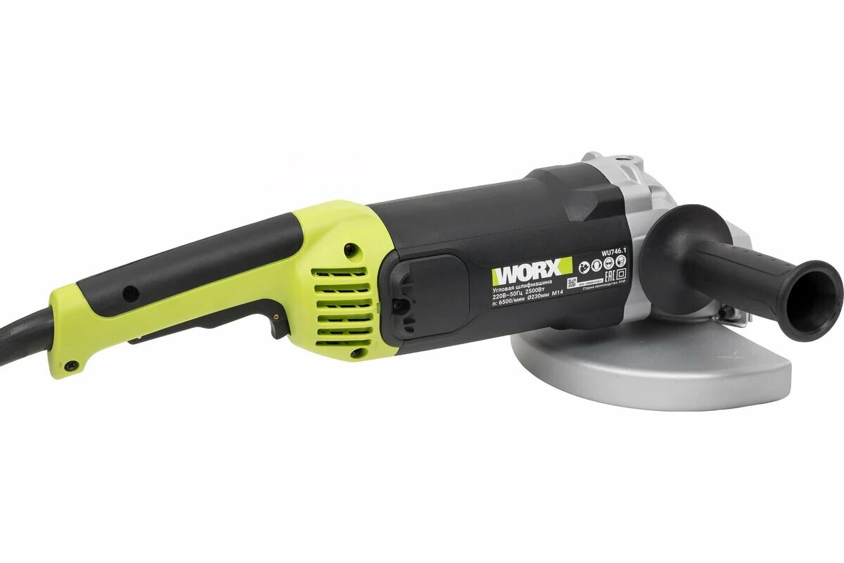 Купить Угловая шлифмашина Worx Professional WU746.1, регулировка положения кожуха, блокировка кнопки включения с доставкой по всей России.