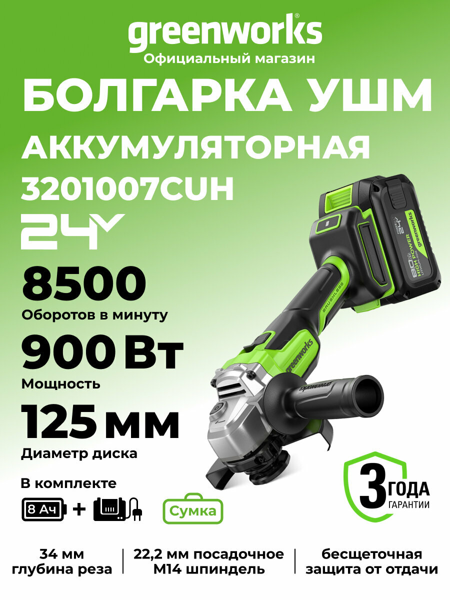 Угловая шлифовальная машина Greenworks 24V, б/щет,900 Вт, АКБ 8Ач и ЗУ