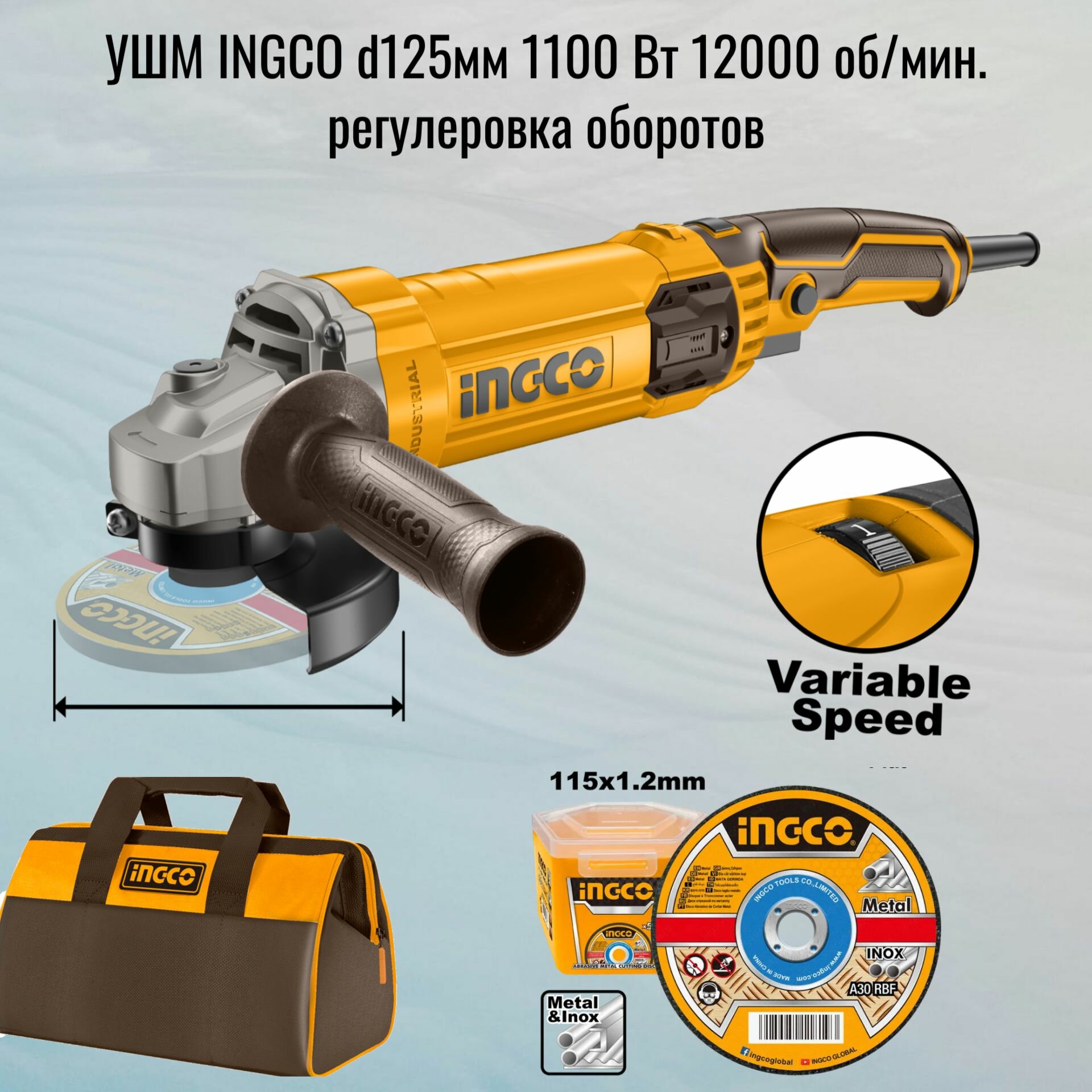 Купить Угловая шлифовальная машина INGCO, 125мм ,1100Вт, рег. оборотов. + Набор дисков + Сумка с доставкой по всей России.