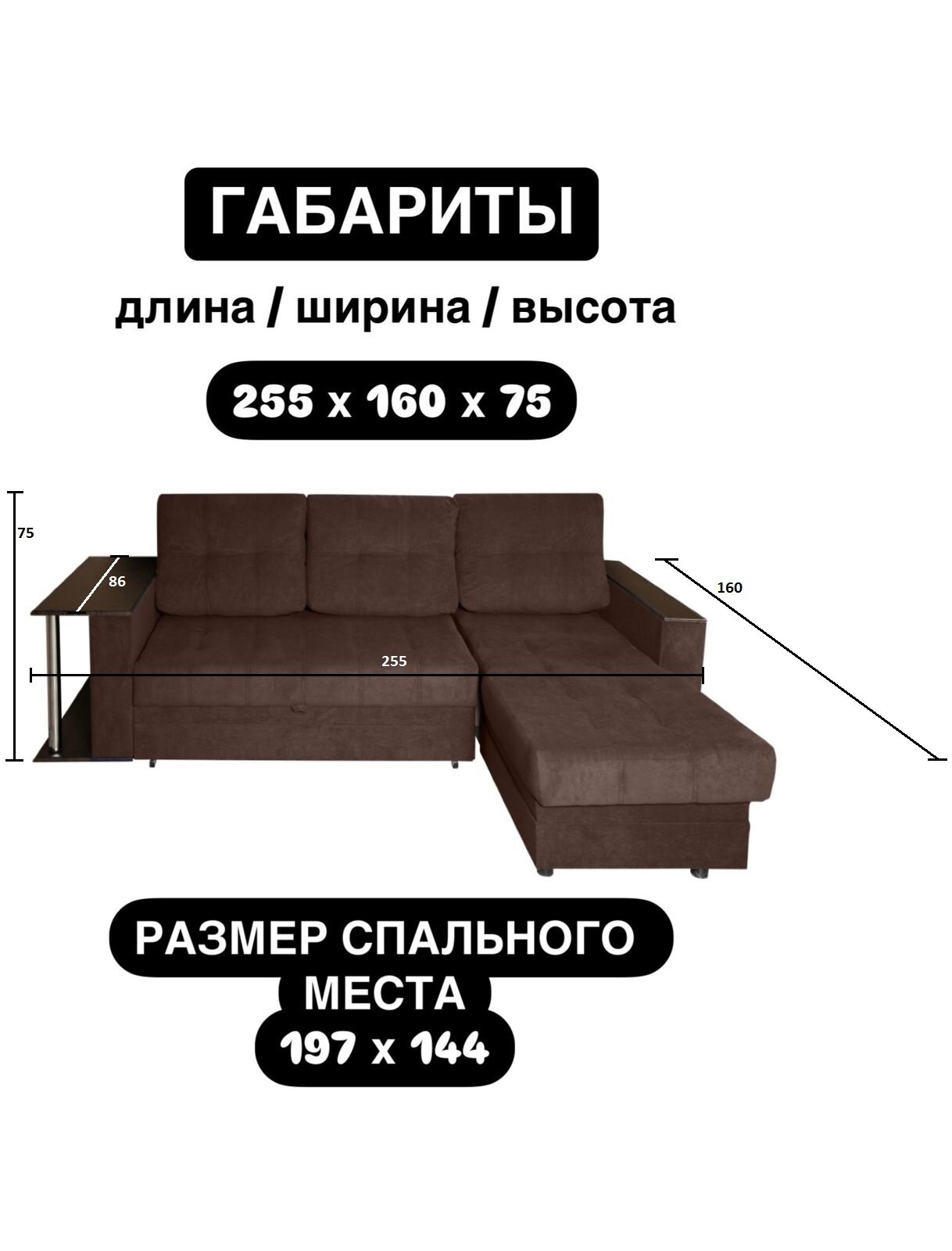 ХАРАКТЕРИСТИКИ - Размер (см): 255х160х75 - Спальное место (см): 197х144 - Каркас: Фанера / ДСП / ЛДСП / - Нагрузка на спальное место (кг):180 - Вес (кг):125 - Наполнитель: ППУ - Гарантия производителя - 18 месяцев - Универсальный угол