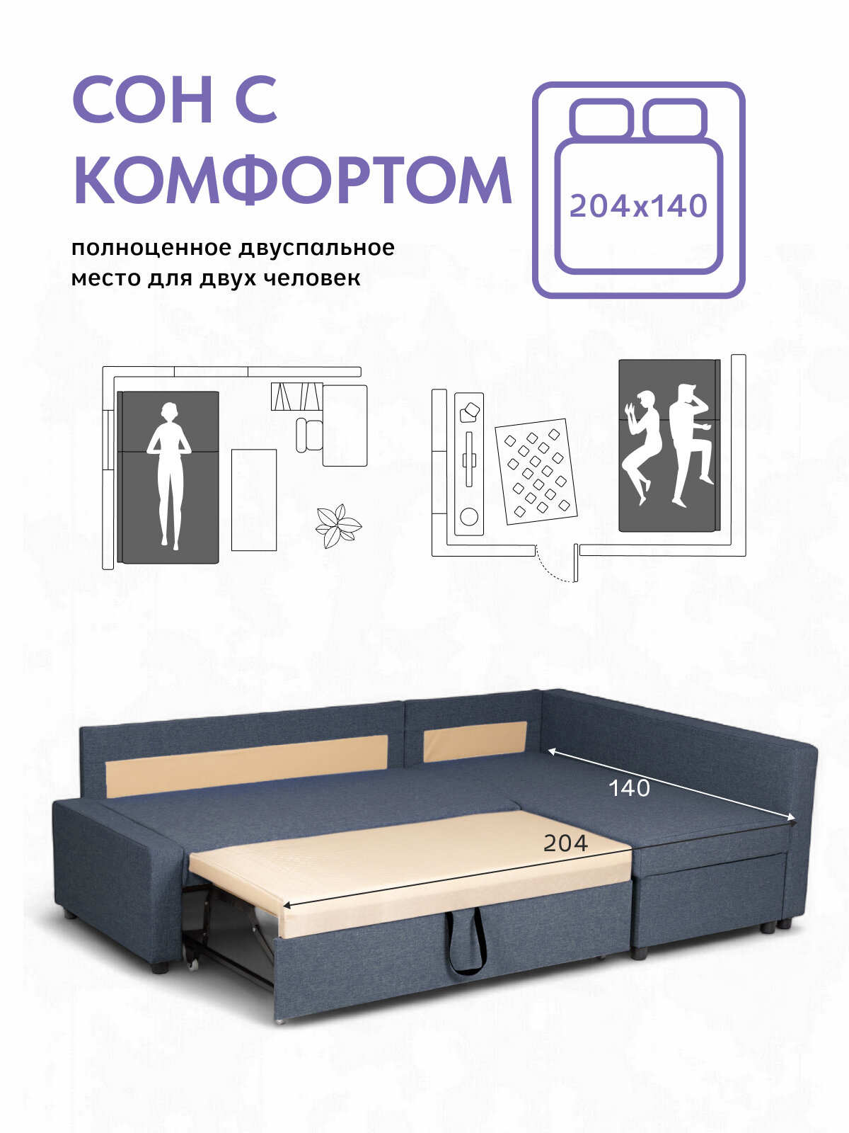 Угловой диван - кровать Кромма Инвуд Лайт, двухместный диван, универсальный угол, синий