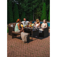 Комплект Римини – мебель высокого комфорта и вместительности. Этот угловой комплект был изготовлен с учетом потребностей наших клиентов - создать уютный вместительный уголок для посиделок на свежем воздухе 7-8 чел. Он является отличным вариантом для загородного дома, гостиницы или летнего кафе. Большой угловой диван представляет собой очень эргономичную модель: изогнутая спинка и мягкие подушки на сидение и на спинке. Дополнительное удобство сидящих по бокам обеспечивают слегка закругленные подлокотники. Стол с закалённым стеклом не только практичен, но и имеет оптимальный размер, специально подобранный для мебели Римини. Поэтому за ним удобно есть, как сидящим на скамейке, так и тем, кто находится на диване. Дополнительные сидячие места обеспечивает плетеная скамейка с мягким посадочным местом. Это – фишка данного комплекта. Практичность комплекта Римини обеспечивают стальной каркас, долговечный искусственный ротанг нового поколения, подушки из ткани, подходящей для использования на улице. Кроме того, все материалы, из которых изготовлена мебель, соответствует экологическому стандарту ISO9001