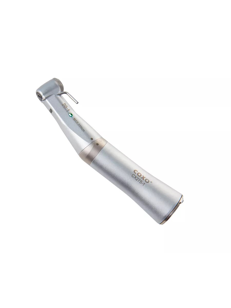 Угловой понижающий наконечник - CX275-1, 20:1, с фиброоптикой, с кнопочной фиксацией бора, с внутренним и внешним охлаждением CX275-1 - угловой понижающий наконечник, применяемый стоматологами в таких областях, как эндодонтия, имплантология, хирургия и ортодонтия. Его преимуществом является высокая работоспособность и надёжность. Стоматологический наконечник CX275-1 производится со стандартной головкой. Характерной чертой такого наконечника является наличие фиброоптики, что позволяет улучшить видимость обрабатываемых участков. Система охлаждения бора осуществляется с помощью внутренней и внешней подачей воды, за счет которых инструмент не перегревается и инфекции не попадают в систему поступления жидкости. Скорость вращения составляет 2 000 об/мин. Особенность этой модели - разборный корпус. Благодаря кнопочному зажиму осуществляется фиксация устройства с головкой наконечника, предотвращая его смещение.