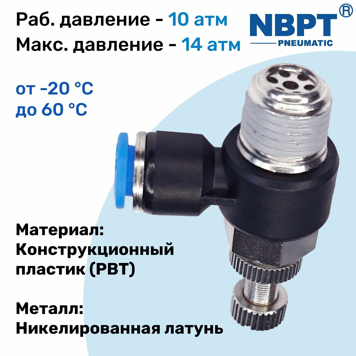 Пневматический угловой (L-образный) регулятор расхода воздуха (Регулятор давления) с обратным клапаном NSC бренда NBPT используется для соединения трубки с различным оборудованием в пневматической магистрали.