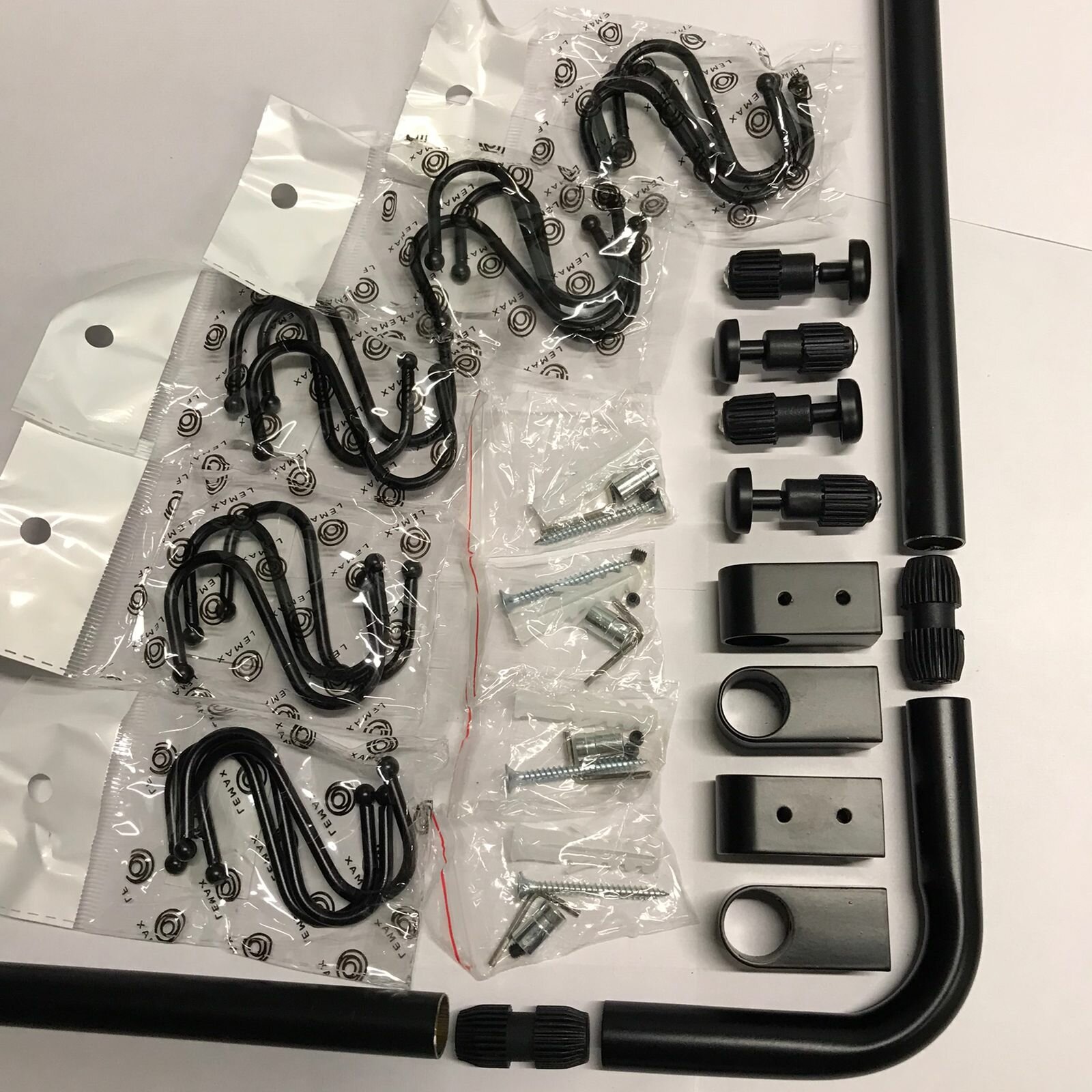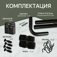 | Подробная комплектация | Рейлинг угловой 15 крючков 4 заглушки рейлинга 4 крепления (держателя) рейлинга к стене крепёж 2 соединительные муфты угол 90гр. |