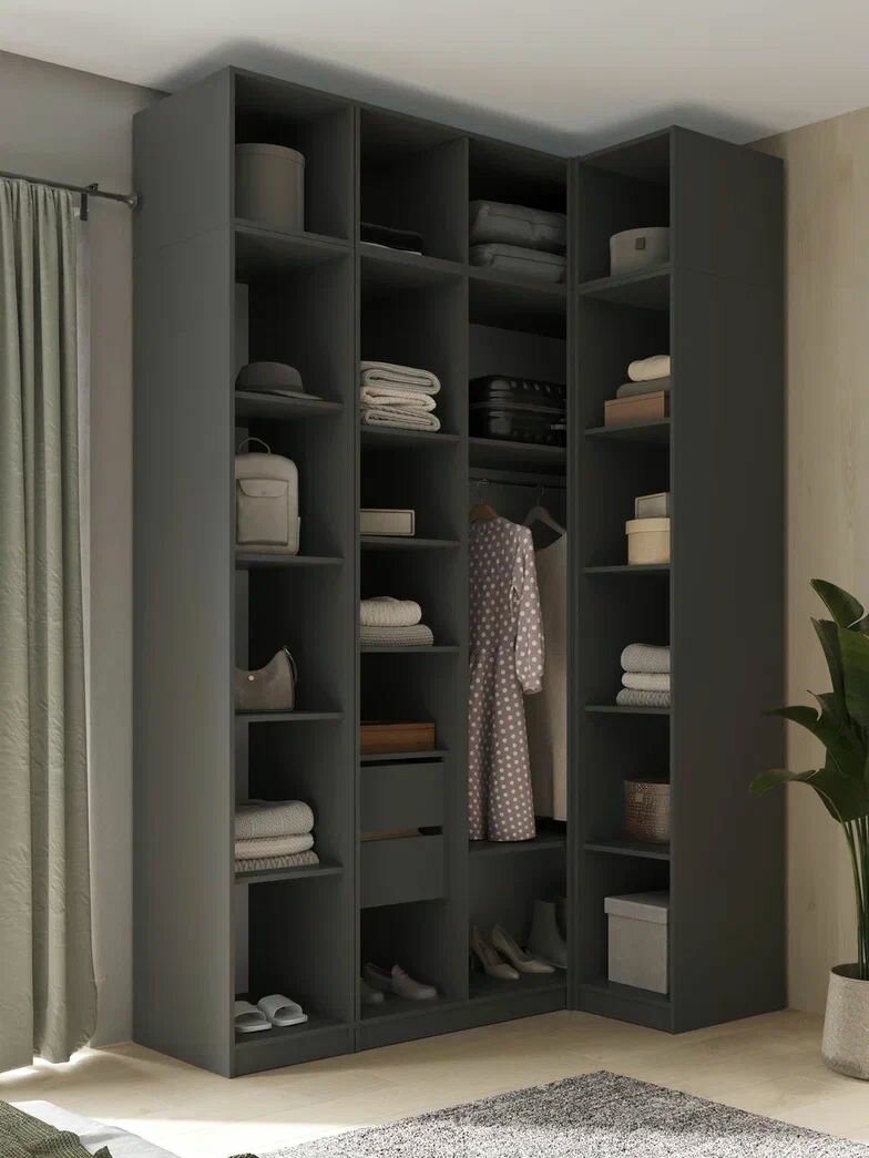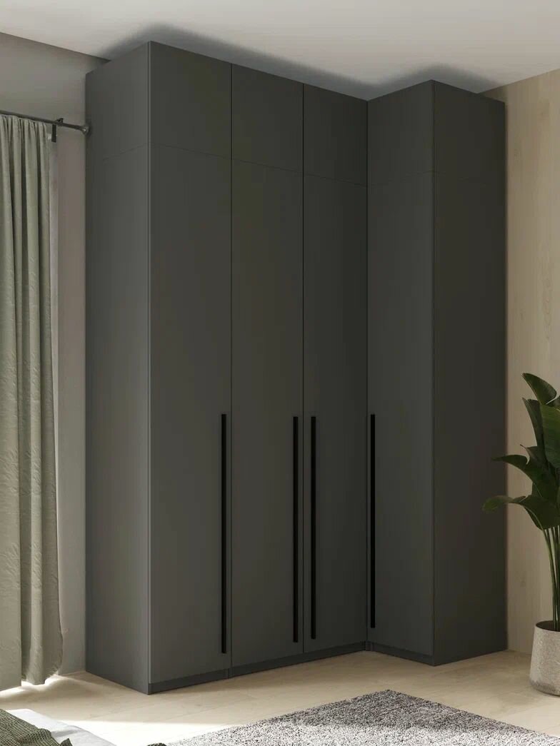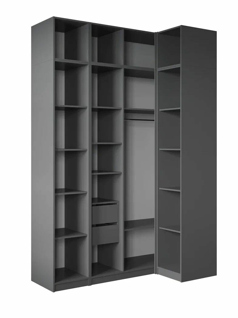 Угловой шкаф для одежды распашной с ящиками и антресолью - это идеальное решение для тех, кто хочет создать гардеробную систему в своем доме или квартире. Этот шкаф имеет три двери, которые открываются в стороны, что обеспечивает удобный доступ ко всем вещам внутри. Кроме того, он оснащен 13 полками и выдвижной внутренней секцией, которая позволяет хранить одежду и другие предметы в порядке и безопасности.