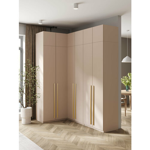 Угловой шкаф для одежды в цвете кашемир с золотыми ручками "Принцесса Мелания" - это идеальное решение для тех, кто хочет создать гардеробную комнату или отдельную зону для хранения одежды. Этот шкаф имеет размеры 2600х2100х1300мм, что позволяет ему легко поместиться в любом помещении.