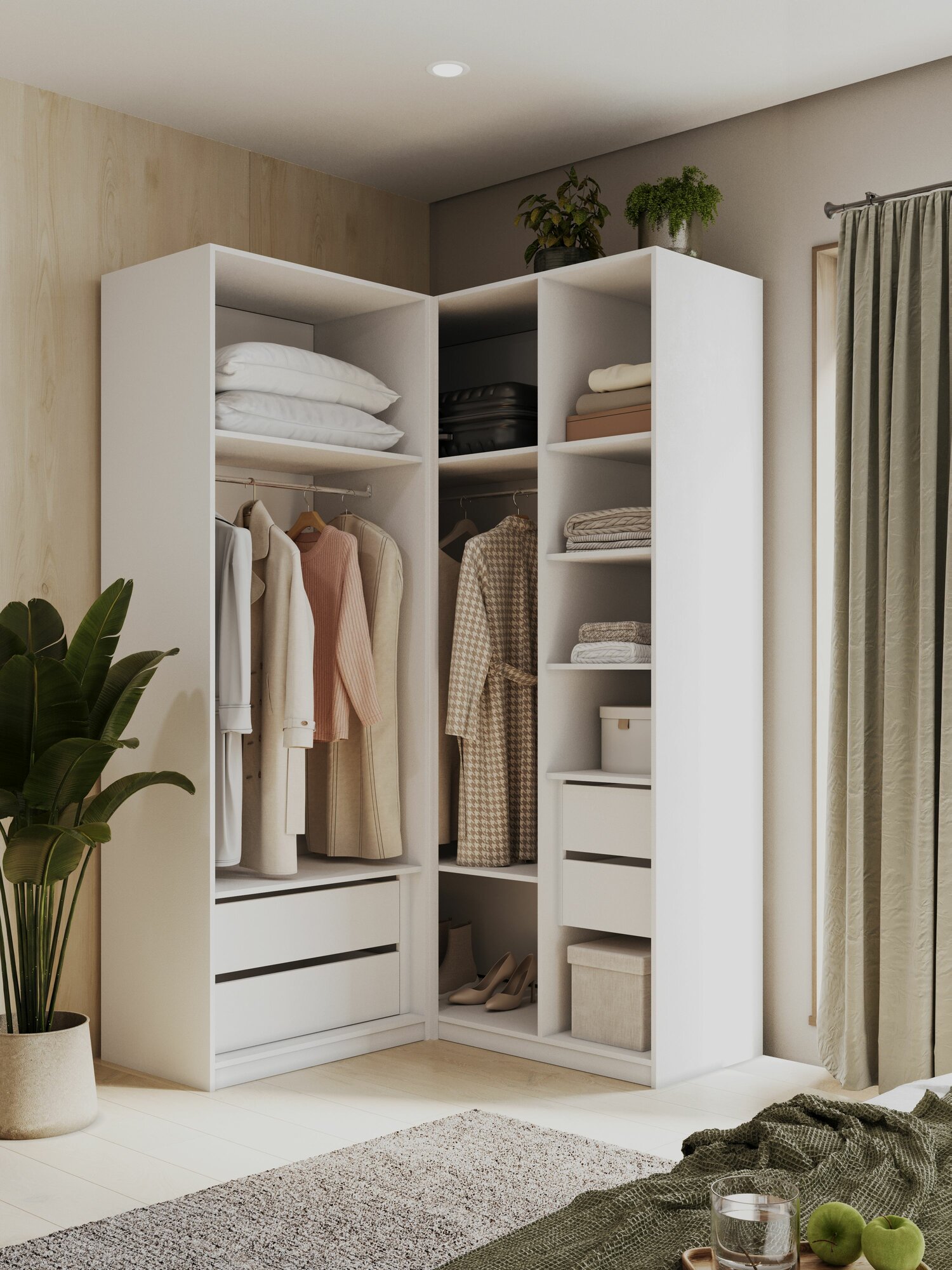 Представляем вашему вниманию угловой шкаф для одежды распашной с ящиками, идеально подходящий для любого интерьера. Этот белый шкаф не только функционален, но и станет стильным акцентом в вашем доме. Он отлично подойдет как для спальни, так и для детской комнаты, а также будет уместен в прихожей или гостиной.