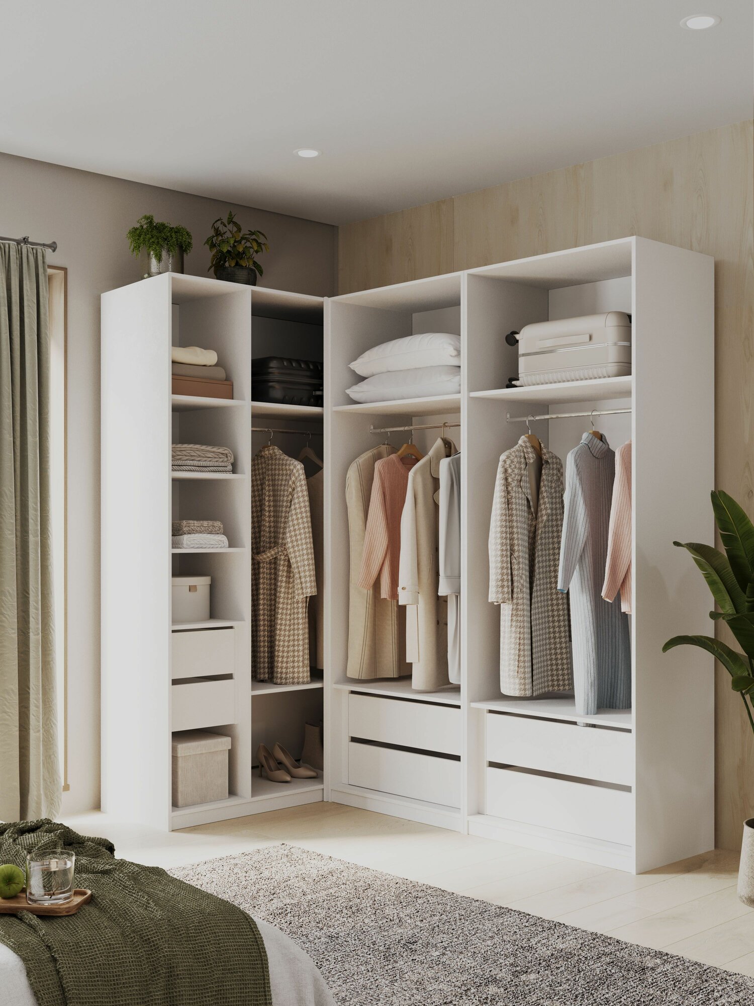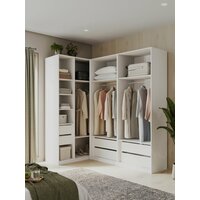 Обладая габаритами 2200х2100х1300 мм, этот угловой шкаф помогает эффективно использовать пространство, идеально подходя для уголков комнаты. Две распашные двери обеспечивают легкий доступ к одежде. Внутреннее пространство организовано разумно: здесь есть несколько полок для одежды и ящики, которые идеально подходят для хранения мелочей.
