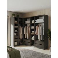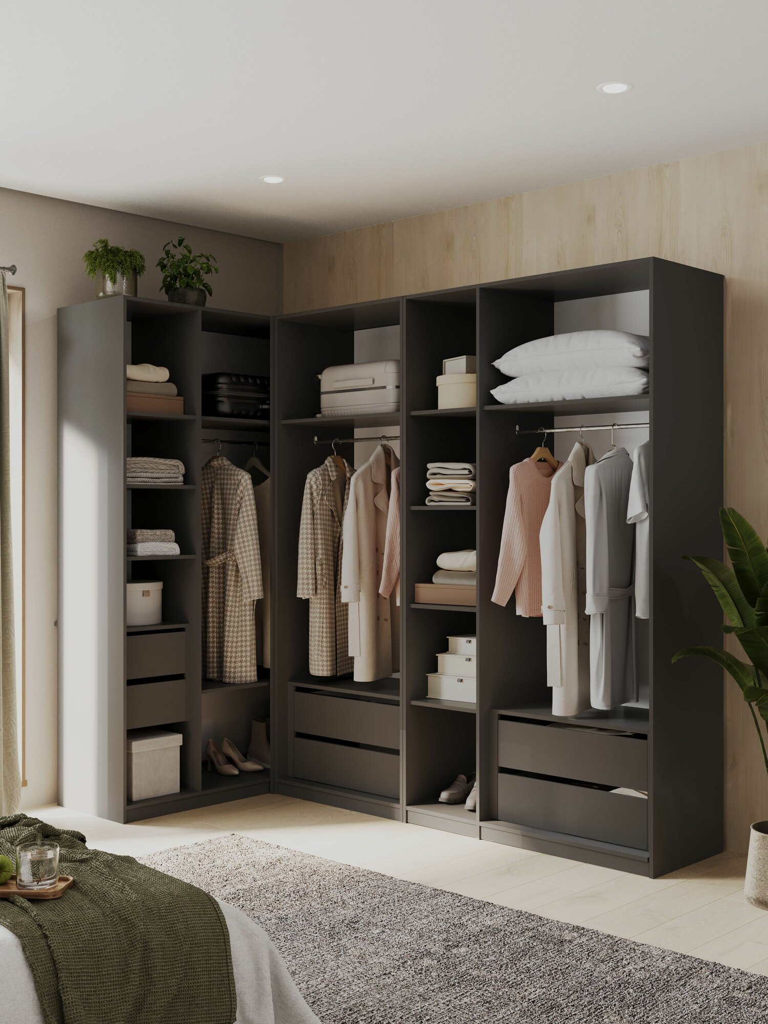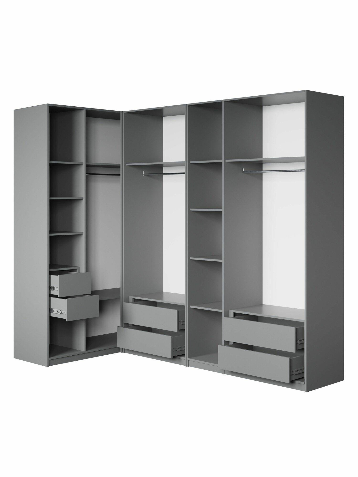 Данный шкаф обладает двумя дверями и несколькими ящиками, что позволяет удобно распределить вещи, сохраняя порядок и доступность. Практичное решение для тех, кто стремится максимально эффективно использовать пространство. Угловой дизайн позволяет разместить шкаф даже в самых узких помещениях, а графитовый цвет добавит элегантности и стиля.