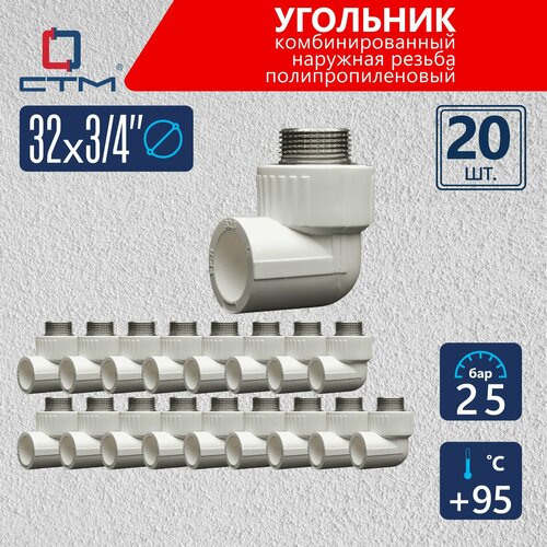 Набор 20 шт. Угол полипропиленовый комбинированный наружной резьбой DN 32х3/4" СТМ пласт предназначен для соединения полипропиленовой трубы под углом 90° с другими трубопроводами с резьбовым соединением, например, из стали. Переходник используется для подключения таких компонентов как краны, клапаны и другие фитинги систем водоснабжения и отопления. ПП трубы и фитинги применимы для горячей и холодной воды, напольного и радиаторного отопления. Монтаж соединителя со стороны полипропиленового трубопровода осуществляется методом раструбной сварки (свариваемые детали после разогрева вставляются друг в друга). Для этого необходимо использовать специальный сварочный аппарат и насадки для пайки. Муфта угловая изготавливается из полипропилена (Polypropylene random copolymer – полипропилен тип 3) и латуни с никелированным покрытием (ГОСТ 15537-2004). Материал экологически безвреден и не выделяет вредных веществ при эксплуатации. Водопровод из полипропиленовых труб и фитингов не меняет вкус, запах и цвет протекающей жидкости. Срок службы - до 50 лет. Максимальное рабочее давление 25 Бар. Максимальная температура рабочей среды +95С.