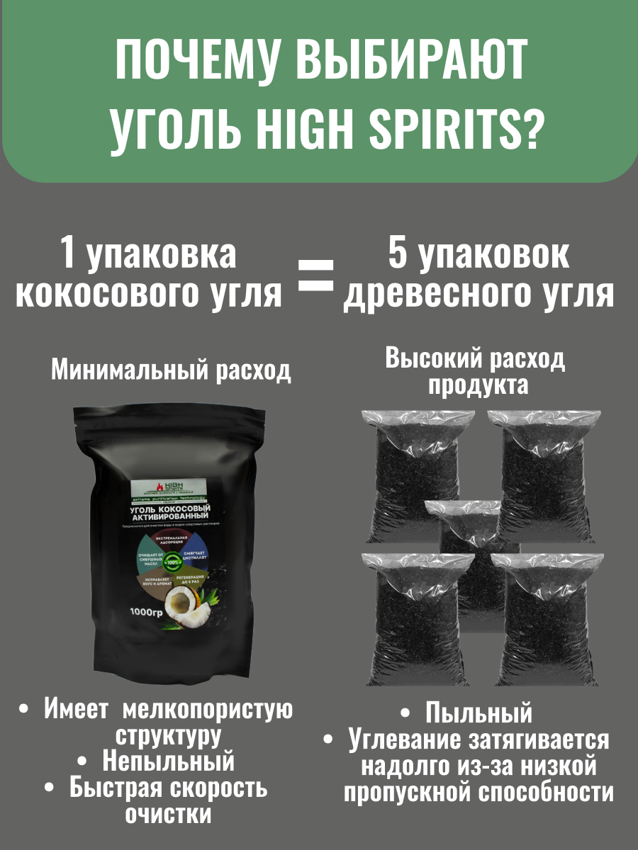 Основным отличительным свойством является содержание в нём полезных веществ (йод, железо), позволяющих не только очищать самогон, но и обогащать его веществами, улучшающими усвоение в организме. У кокосового угля меньший уровень пыли и большее количество микропор, что уменьшает его расход. Для очистки дистиллята вам потребуется 1 кг нашего HyperPure Carbon Premium вместо 5 кг угля древесного (березового). Алкоголь, пропущенный через активированный уголь, пьется мягче, при этом его применение абсолютно безвредно для организма, чего нельзя сказать о химических способах фильтрации самогона.