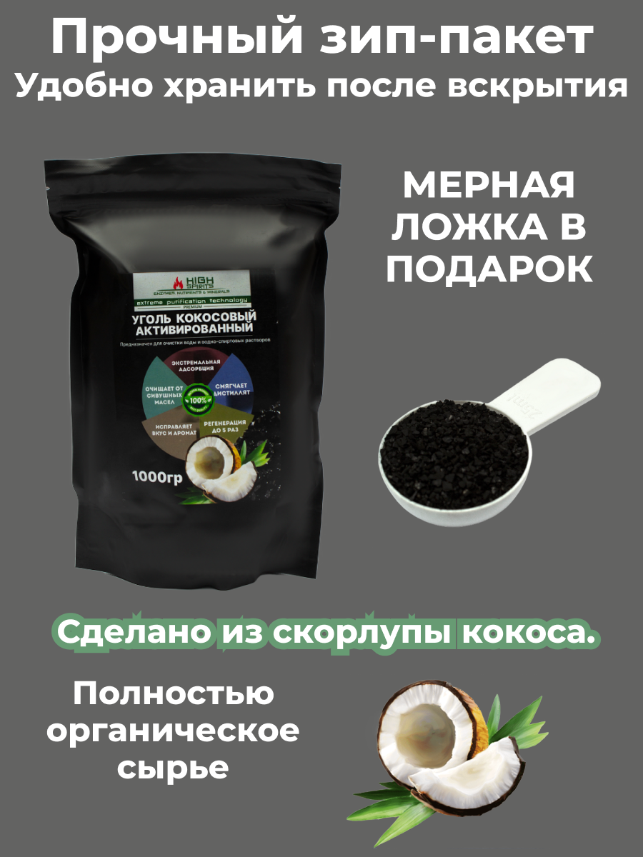 Уголь кокосовый для самогона — имеет высокую поглощающую способность, что делает его идеальным для очистки получаемых дистиллятов от сивушных масел и вредных примесей и позволяет получить чистый и прозрачный спирт.