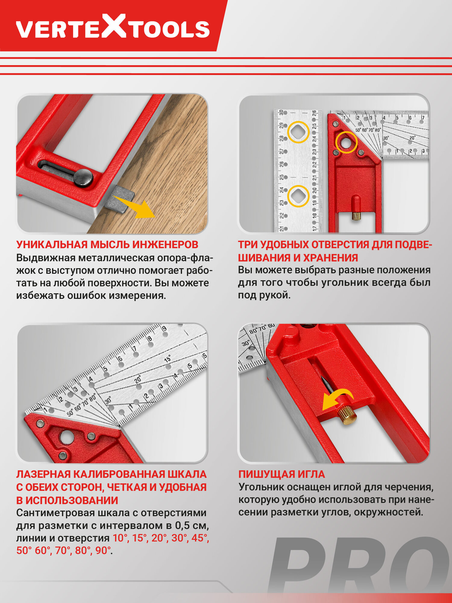 - Пишущая игла Угольник оснащен иглой для черчения, которую удобно использовать при нанесении разметки углов, окружностей Уникальная мысль инженеров. Выдвижная металлическая опора-флажок с выступом отлично помогает работать на любой поверхности. Вы можете избежать ошибок измерения,