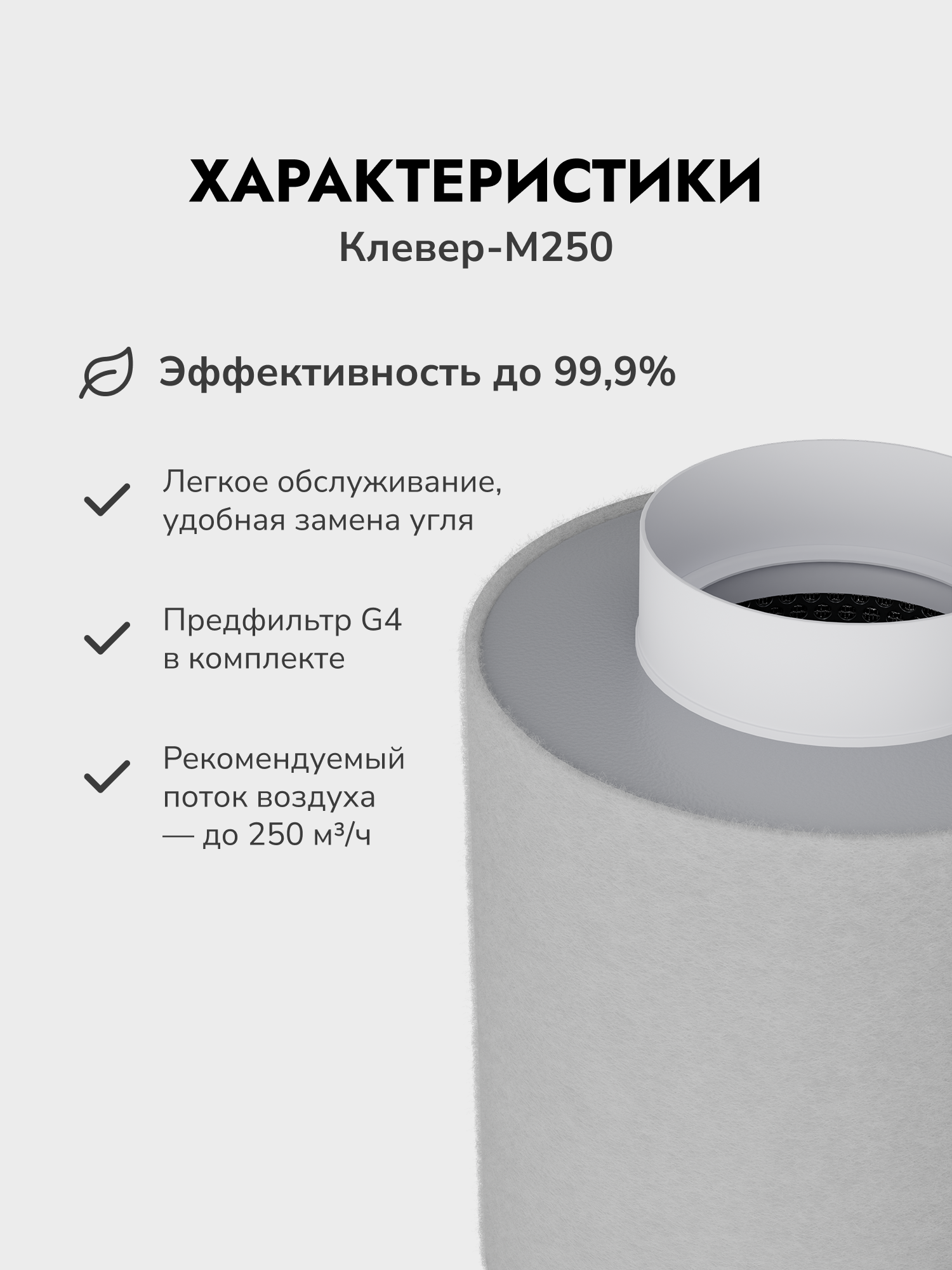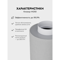 Характеристики Фильтра КЛЕВЕР-М250: Производительность вентилятора до 250м3/час, Диаметр патрубка/ Диаметр корпуса/ Высота фильтра с патрубком (мм) - 100/180/332 Количество угля (кг/литров) - 2,2/4,4 Вес фильтра (кг) - 3,2* (Вес может незначительно изменяться в зависимости от влажности окружающего воздуха и партии угля)
